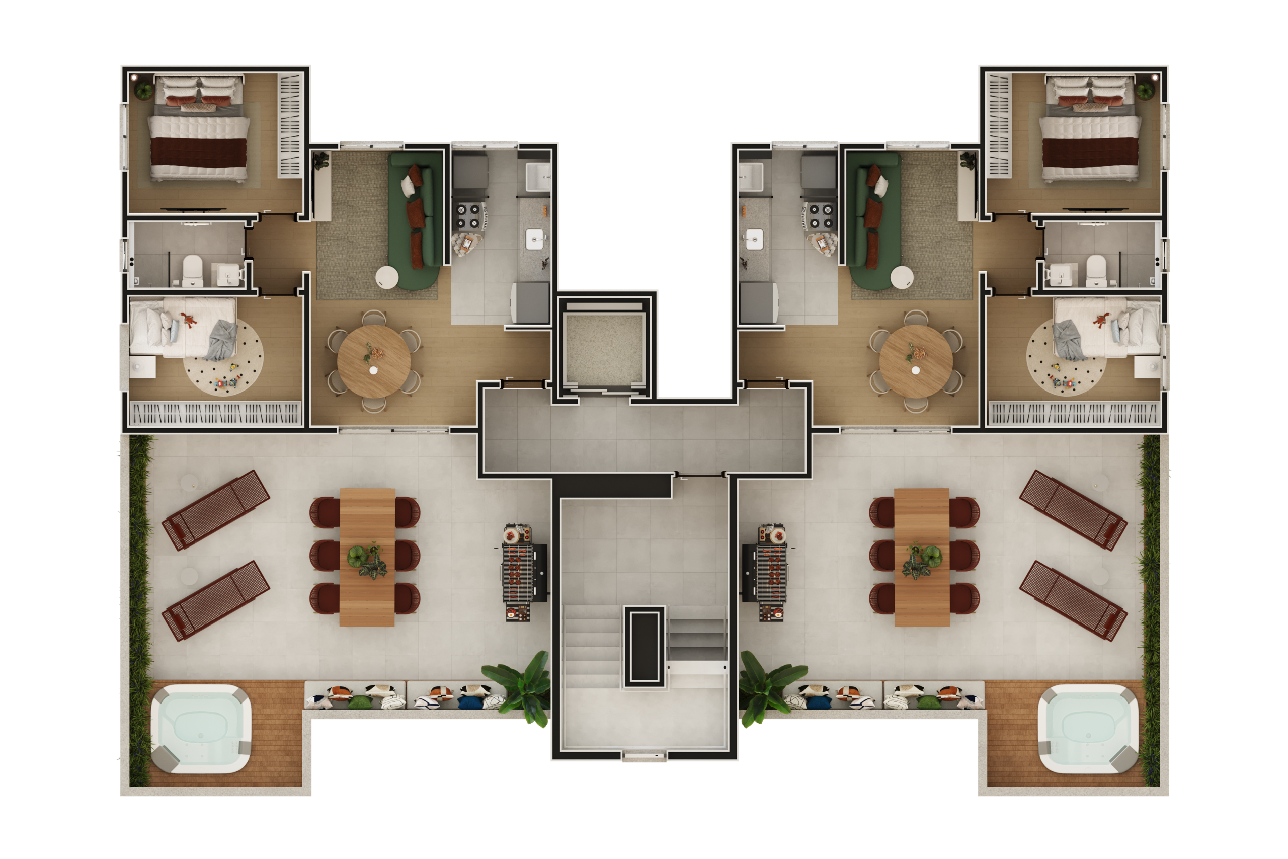 Os apartamentos de 2 quartos foram cuidadosamente projetados para proporcionar uma experiência completa de moradia, com ambientes funcionais e bem planejados.